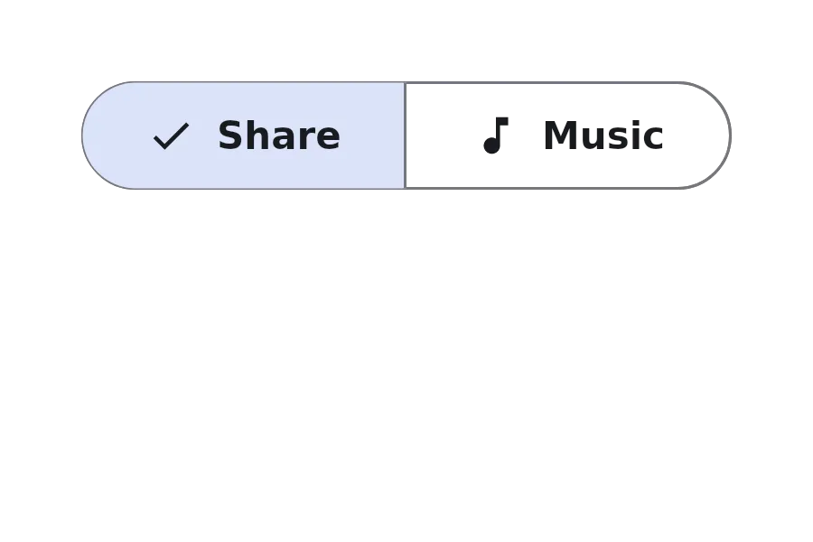 import { SegmentedButton } from "@material";export component Example inherits Window { width: 300px; height: 100px; background: transparent; SegmentedButton { items: [ { icon: @image-url("../icons/share.svg"), text: "Share" }, { icon: @image-url("../icons/music_note.svg"), text: "Music" } ]; current-index: 0; }}slint