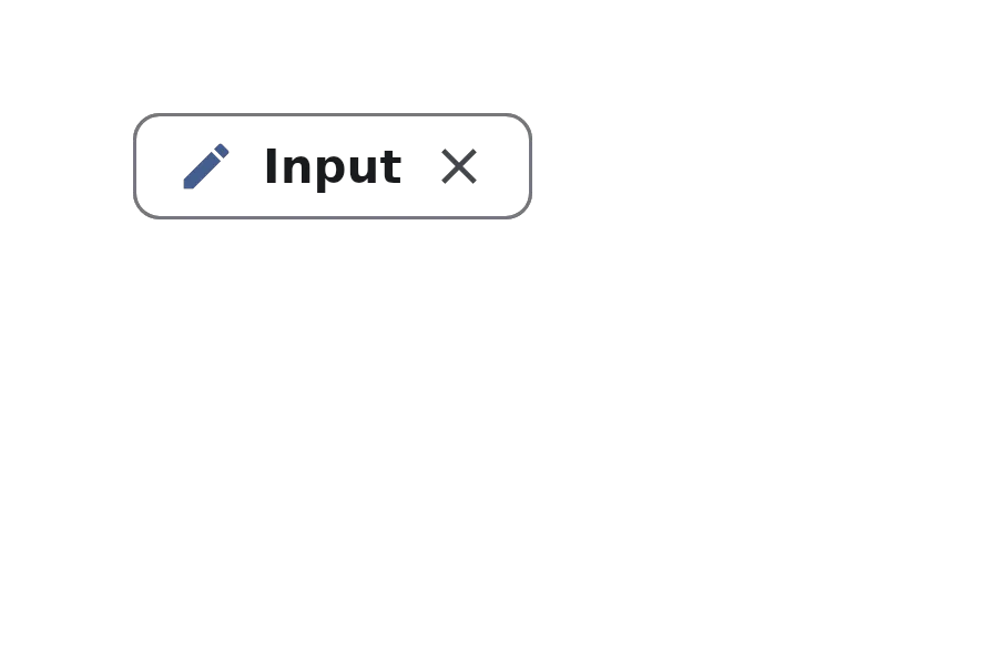import { InputChip } from "@material";export component Example inherits Window { width: 200px; height: 100px; background: transparent; InputChip { text: "Input"; leading-icon: @image-url("../icons/edit.svg"); trailing-icon: @image-url("../icons/close.svg"); width: 120px; height: 32px; }}