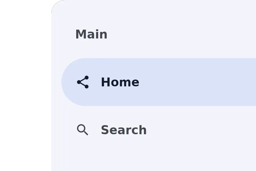 import { NavigationDrawer } from "@material";export component Example inherits Window { width: 400px; height: 300px; background: transparent; navigation_drawer := NavigationDrawer { width: 280px; height: parent.height; groups: [ { title: "Main", items: [ { icon: @image-url("../icons/share.svg"), text: "Home" }, { icon: @image-url("../icons/search.svg"), text: "Search" } ] } ]; }}